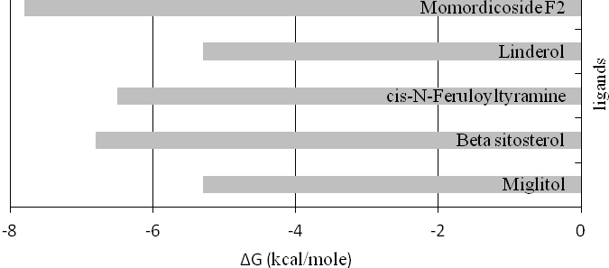 Docking analysis revealed that momordicoside F2 had the best binding affinity (-7.80 kcal/mole) followed by beta-sitosterol (-6.80 kcal/mole) and cis-N-Feruloyltyramine (-6.50 kcal/mole). However, linderol turned out to have the same binding affinity with miglitol (-5.30 kcal/mole) which indicated its possibility of having similar pharmacological functions with miglitol drug.