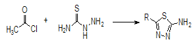 Method 6. Another method of synthesis of 2-Amino-5-aryl-1,3,4-thiadiazole is by the reaction of thiosemicarbazide, aromatic carboxylic acid in conc. sulphuric acid. Then the compound was converted to chloroacetyl derivative by its reaction with chloroacetyl chloride in the presence of sodium acetate in acetic acid. Finally it was transformed in to N-(5-(4-aminophenyl)-1,3,4-thiadiazole-2-yl)-2-chloroacetamide.
