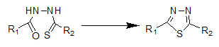 Method 7. Monothiodiacylhydrazines (prepared from the acylation of thiosemicarbazides or as intermediates in the reactions of thiohydrazides with carboxylic acids and their derivatives) was cyclized through dehydration with sulfuric, polyphosphoric (PPA) or methanesulfonic acids to give 1,3,4-thiadiazoles.