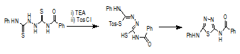 Method 10. Reaction of acylbithioureas 21 with p-tosyl chloride in presence of triethylamine (TEA) provided a 90% yield of the benzoylated thiadiazole 23, presumably via the intermediate.