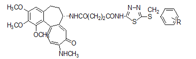 The action connected with the apoptotic mechanisms and angiogenesis, which is a crucial step in the tumorigenesis, seems to be very promising in anticancer therapy. In order to obtain compounds with better anticancer activities, a variety of novel colchicine derivatives (Fig. 24) were synthesized by combining N-methyl colchiceinamide and differently substituted 1,3,4-thiadiazole moieties by Shen Li Hong et al and tested their anticancer activities against a selected panel of human cancer cell lines. The results indicated that most of the derivatives showed significant anticancer activities, particularly, two of the compounds showed more potent cytotoxic activities of all screened cancer cells than colchicines [17].