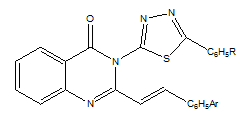 Thiadiazole with styryl and quinazoline were reported to exhibit wide range of anticonvulsant, sedative, tranquilizer, analgesic, antimicrobial, anesthetic, anticancer, antihypertensive, antiinflammatory, diuretic and muscle relaxant properties. With the intention to develop potent anticonvulsant agents Bhandari et al designed, synthesized 3-[5-substituted 1, 3, 4-thiadiazol-yl]-2-styryl quinazolin-4(3H)-ones derivatives. The synthesized derivatives (Fig. 32) were tested in vivo for their anticonvulsant activity using MES, PTZ and Actophotometer model. The synthesized compounds, showed significant anticonvulsant activity comparable to the standard phenytoin, diazepam and phenobarbital [27].