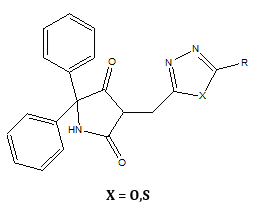 1,3,4-oxadiazole, 1,3,4-thiadiazole or 1,2,4-triazole were known as hybrids between phenytoin drug and thiosemicarbazides. Some new phenytoin derivatives (Fig. 35) were synthesized by Botros et al utilizing these heterocyclic moieties and these were assessed for anticonvulsant activity. Preliminary anticonvulsant screening was performed using standard maximal electroshock (MES) and subcutaneous pentylenetetrazole (sc PTZ) screens in mice.