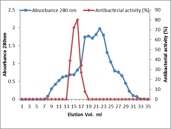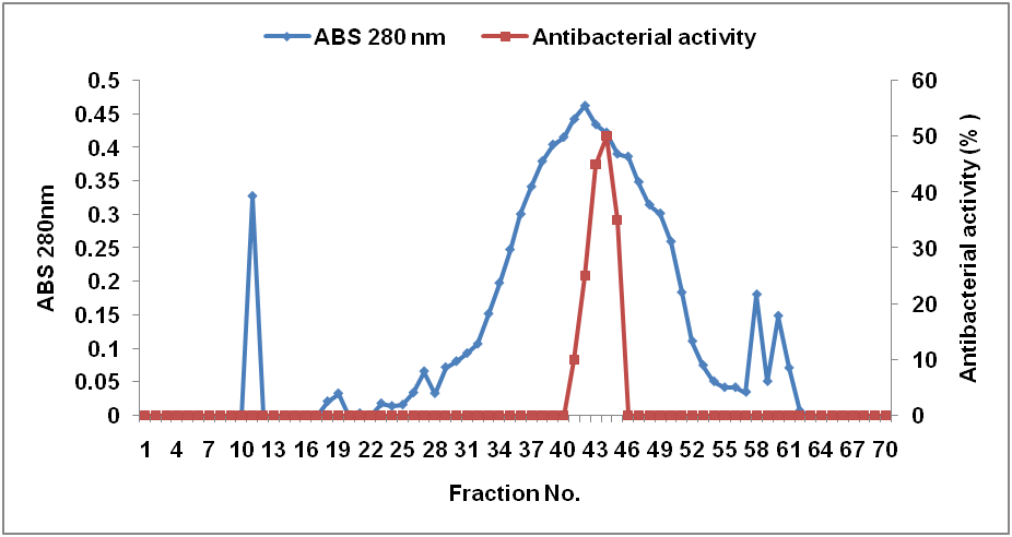 Subsequently, the active fractions were separated by a Sephadex G-25 column and the active fractions were investigated for antimicrobial activities and cytotoxic activity. These results in consensus with previous studies that documented the antimicrobial substances could be purified by many methods like chromatography methods depending on the physical characteristics, chemical structure and molecular weight of the antibiotics [27-29].