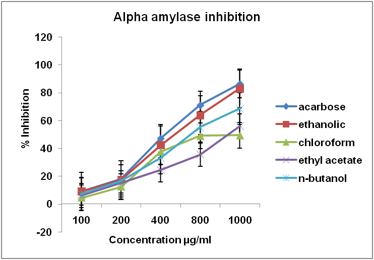 Fig. 1: In vitro inhibition of α-amylase enzyme by various extracts of leaves of Ficus semicordata. The results represents the mean±SEM (n=3)