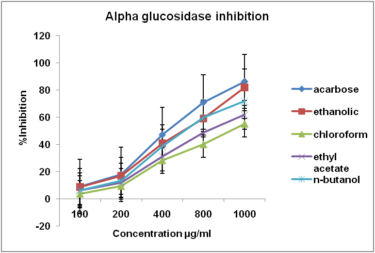 Fig. 2: In vitro inhibition of α-glucosidase enzyme by various extracts of leaves of Ficus semicordata. The results represents the mean±SEM (n=3)