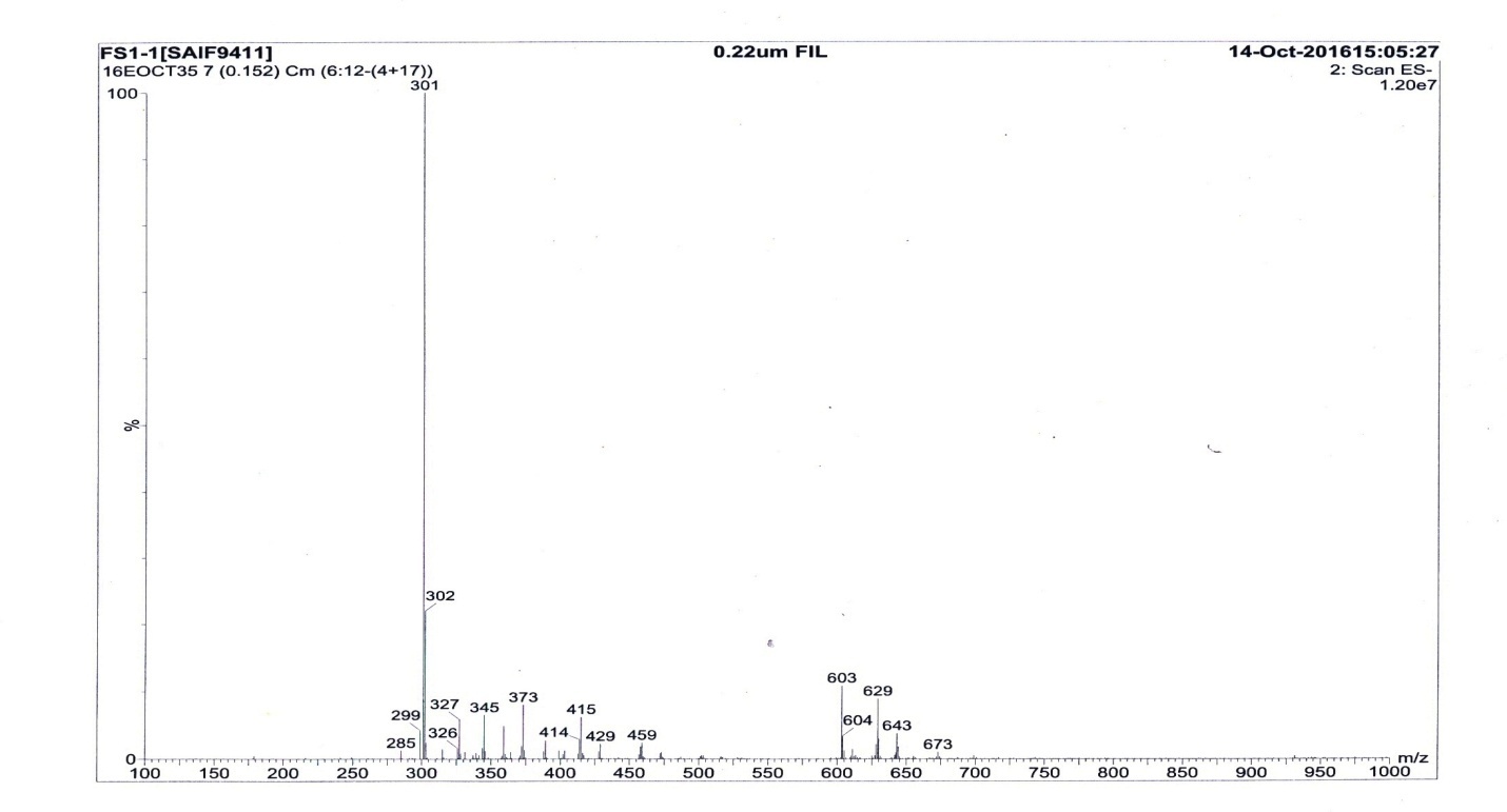 Compound FS-1 Elution of the column with n-hexane: dichloro-methane (8:2) fraction no. F3, F4 was obtained as a yellow powder that after recrystallization with methanol formed an amorphous yellow powder. Yield = 475 mg, M. P = 215-217 °C Rf =: 0.67, [toluene (5): ethyl acetate (4): formic acid (1)] IR: (KBr, νmax, cm-1): 3400 (O-H stretching vibration of phenol-OH), 3021.77 (C-H stretching of aromatics), 1718.64 (C=O stretching vibration-OC=O-),), 1602.26 (C=C stretching vibration, alkene), 1467 1425, 1215 (C-OH stretching vibration, phenol-OH), 1262 (C-O-C), 928.22, 763.96, 671.08, 627 (C-H out of plane bending of aromatic hydrocarbon).