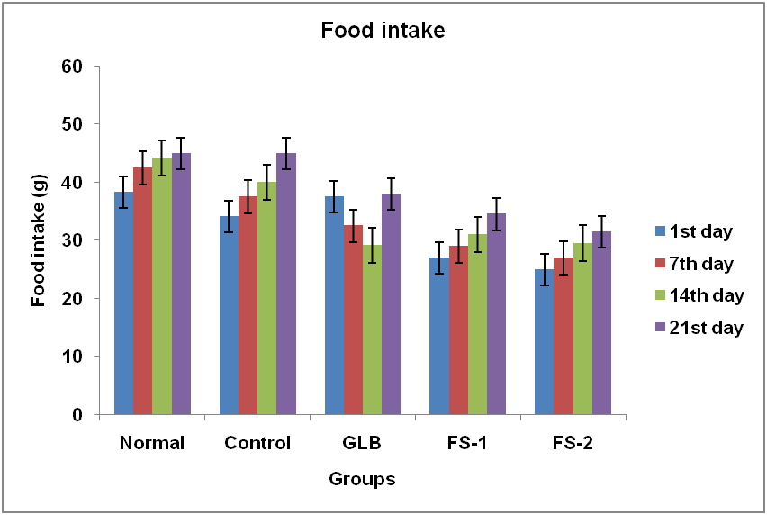 Fig. 13: Effect of isolates FS-1, FS-2 and standard antidiabetic drug, glibenclamide (GLB) on food intake (g) in STZ induced diabetic rats. Each bar represents the mean±SEM (n=6).