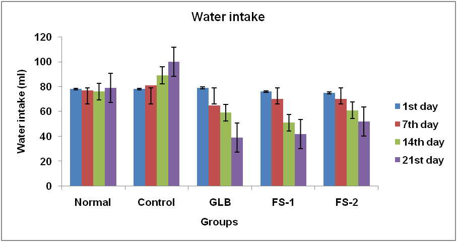 The food and water intake and urine output were decreased in diabetic rats treated with both isolated compounds and glibenclamide. The effect of compound FS-1, FS-2 at the tested dose levels, considerably reduced food and water intake and urine output of hyperglycemic rats in comparison to the diabetic control group by the end of the 21st d.