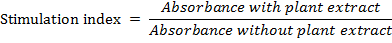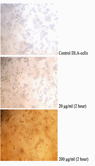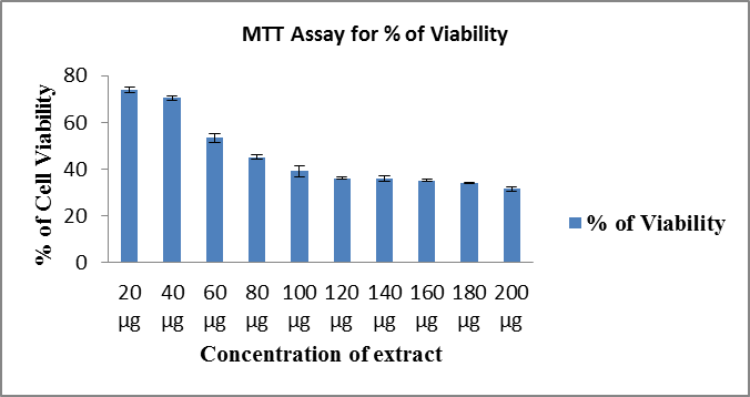 The cytotoxic activity of plant extract against DLA cells was determined by MTT assy. MTT assay was performed in a 96-well culture plate according to a previously published protocol [22]. The plant extract was dissolved in dimethyl sulfoxide (DMSO) and diluted appropriately by using RPMI medium. Then 105cells/ml were seeded into each well of a microtiter plate then plant extracts were added at concentrations 20, 40, 60 and 200µg/ml per well. The volume in each well was made up to 200 µl with RPMI medium. Cells treated with DMSO were used as a control. The treated cells were incubated in CO2 incubator for 48 hrs*, 20 µl of MTT (HI Media) solution (5 mg/ml) was added into each well and incubated for 4 hrs*. Purple-colored formazan crystals formed in each well were dissolved by adding 200 µl of DMSO. The optical density was measured at 570 nm. All the experiments were performed in triplicates. Percentage of viability was checked by calculated stimulation index using following formulae.