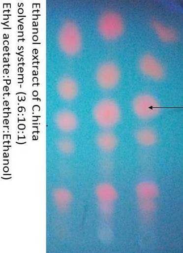 Fig. 5: TLC Analysis of ethanol extract of Clidemia hirta with suitable mobile solvent system and marked band showed the anticancer activity
