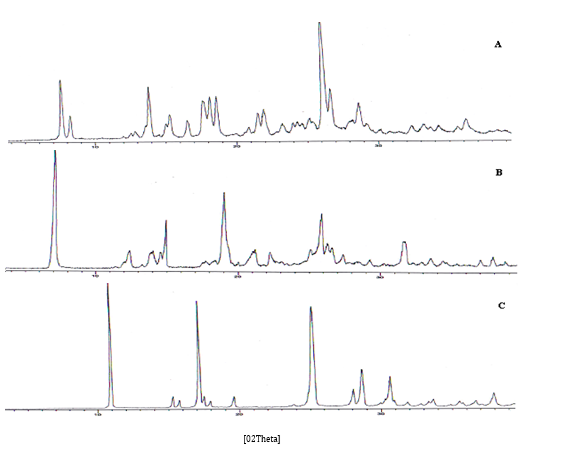 Fig. 1: PXRD pattern of PF (A), PF-NCT (B) and NCT (C)
