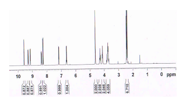 Fig. 2 represents the 1HNMR pattern of the PF-NCT cocrystal.1HNMR shows small changes in the chemical shifts of cocrystal due to weak intermolecular hydrogen bonding between the two components. The 1HNMR chemical shift assignments of PF–NCT are as follows. (CF3COOD, 400 MHz): δ 9.8 (S, 1H), 9.28 (m), 9.14 (d, 1H, J=5.88 Hz), 8.36 (1H, m), 8.25 (d, 1H, J=12.7 Hz), 7.16 (d, 1H, J=6.68Hz), 6.6 (q, 1H, 6.44 Hz), 4.6 (s, 1H), 4.1-4.3 (m, 4H), 3.6–3.8 (m, 4H), 2.37 (m, 6H).