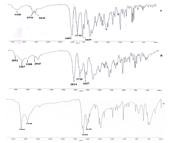 Fig. 3: FTIR of PF (A), PF-NCT cocrystal (B) and NCT (C)