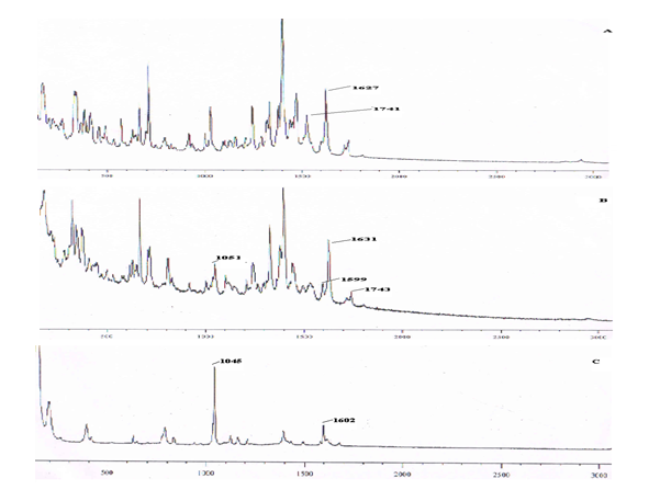 Fig. 4: Raman spectra of PF (A), PF-NCT (B) and NCT (C)
