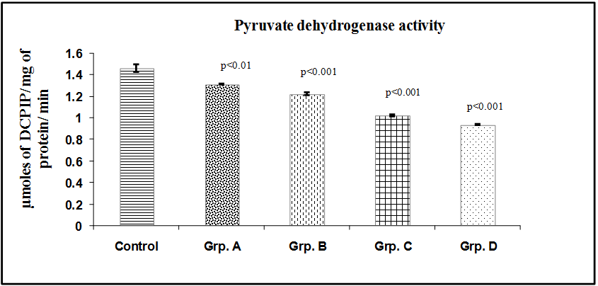 The PDH enzyme activity was determined by the method of Liu and Bisswanger [16]. The enzymatic assay mixture was made up of triethanolamine buffer containing 0.1M MgCl2, 0.1 M pyruvate, 0.01 M thiamine diphosphate and 0.01 M DCPIP at pH 7.8 and the kinetic changes at 597 nm were observed for five min at 15 s interval. The results were expressed in terms of reduction of DCPIP µmol/min/mg of protein.