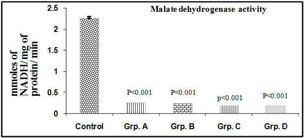 Lead treatment significantly reduced the activity of MDH in hepatic tissue of mice in a dose-dependent manner (fig. 4). The decrease was found to be 88.64% (p<0.001), 89.6% (p<0.001), 90.9% (p<0.001) and 91.8% (p<0.001) respectively in four different doses of lead treatment as compared to the control group.