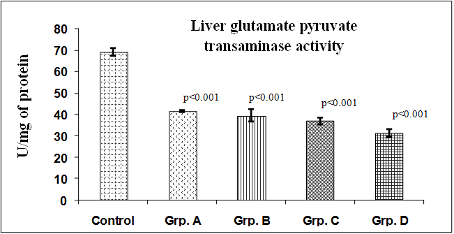 Fig. 6: Activity of liver glutamate pyruvate transaminase at different doses of lead in mice. Values are means±SEM. *** p<0.001 is considered as highly significant. X-axis represents the different lead treated groups while Y axis represents the unit. Experiments were performed in triplicates (n=3), numbers of animals in each group were 6