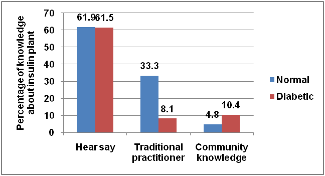 One interesting feature noted during the survey was that 62% subjects in both the groups came to know about insulin plant by hearsay, 33% among normal and 8% among diabetic persons from the traditional practitioner and 5% among normal and 10% among diabetic persons from community knowledge. With respect to knowledge of insulin plant, there was no statistically significant difference (P=0.688) between normal and diabetic people (fig. 1).