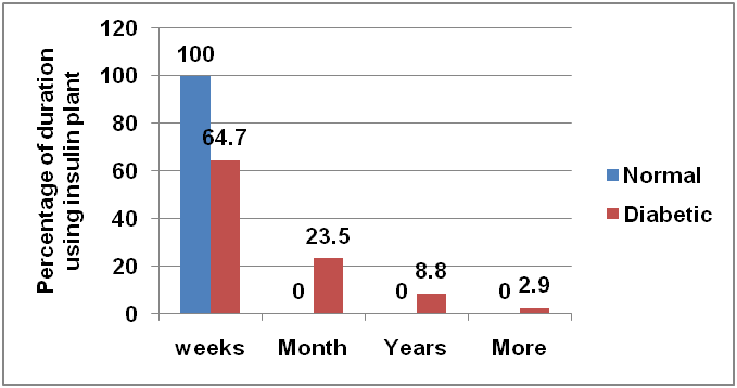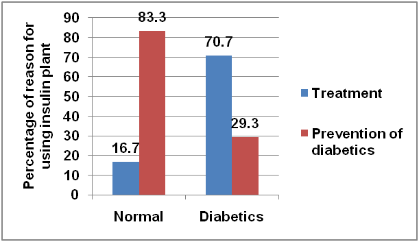 16.7% among normal and 70.7% among diabetic people used insulin plant for a beneficial effect on blood glucose and the number of normal people who used it for prevention of diabetes was 83.3 % and 29.3% among diabetics (fig. 2). The difference in the proportion was statistically much significant (p<0.001).