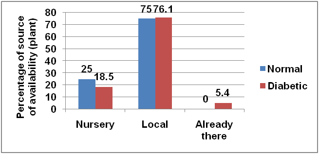 The major source of plant was local area (75% among normal and 76% among diabetics), followed by nursery (25% among normal and 19.2% among diabetes people) and from their own garden (5.4% diabetic people) No significant difference in sources among normal and diabetic people (p>.05) was found (fig. 3).