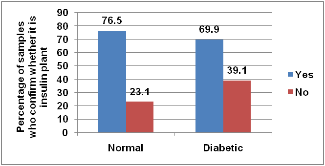Regarding identification of the plant, nearly 70% among diabetic people confirmed it is insulin plant compared to 76% among the normal. However, this difference was not found to be statistically significant (p>0.05) (fig. 4).