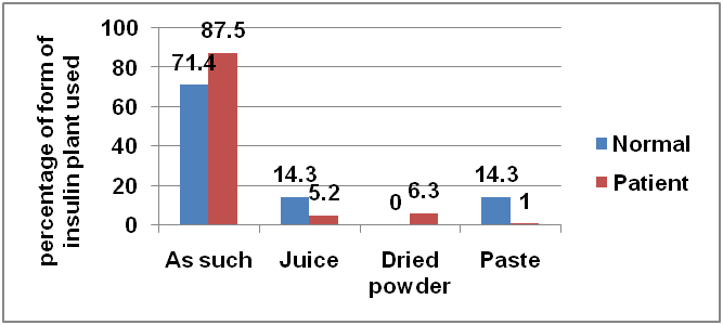 Most of the diabetic persons (88%) used leaves of the plant as such compared to 71% among the normal group. No significant difference was noticed between normal and diabetic populations (p>0.05). Other forms of using insulin plant were found to be much lower among diabetic people as well as normal people (fig. 5). The percentage of peoples using leaves as such was very high (88%) as compared to use in other form. The rason may be the convenience of use and satisfactory benefit from leaves itself.