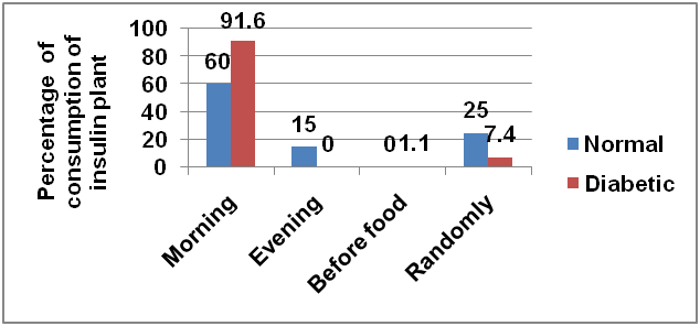 Among the total cases studied 86.1% people used insulin plant daily and 13.9% people used it occasionally. No significant difference was noticed among normal and diabetes people (p>0.05). Among diabetic patients, about 92% used insulin plant in the morning compared to 60% among normal. Other time of use was much less except the random time use (25% among normal) and 15% of normal in the evening (fig. 6). Here the difference between groups (diabetic and normal) was statistically significant (p<0.01).
