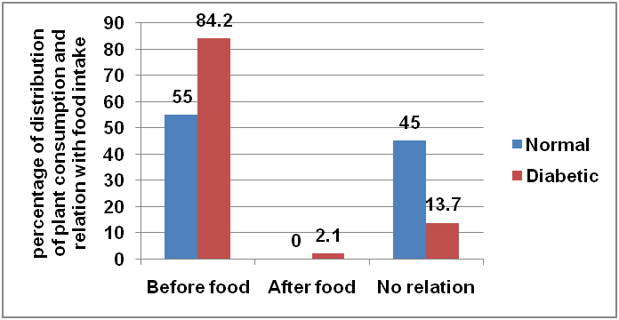 78.9% subjects were taking one leaf daily while 21.1% people had two leaves daily. There were 79.1% subjects which responded that the plant has to be taken before food. Among these 84.2% were diabetic and 55% were normal. 19% subjects said that there was no relation with food intake and 2% people told, the plant has to be consumed after food (fig. 7). Here the difference between groups (diabetic and normal) was statistically significant (p<.01).