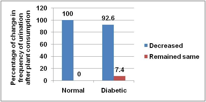 Most of the people preferred to take the leaves as such in the morning. More than three forth people noticed a decrease in urination and thirst after use of this plant. About 97.8% people noticed a decrease in fasting blood sugar and more than 70% people found a decrease in postprandial sugar level. One of the interesting features is that some people are using this plant from last several years as an aid to manage their diabetes.