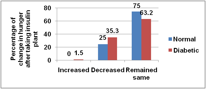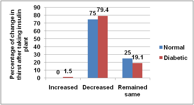Decrease in the frequency of urination was reported by 100% among normal and 93% among diabetic while 6.9% subjects said that there was no change in the frequency of urination after taking insulin plant (fig. 8). Decrease in the thirst was reported by 79.2% subjects while 19.4% subjects did not experience any change in thirst after taking insulin plant (fig. 9). Decrease in hunger was reported by 25 (34.7%) subjects while 46 (63.9%) people said that there was no change in hunger after taking insulin plant (fig. 10).
