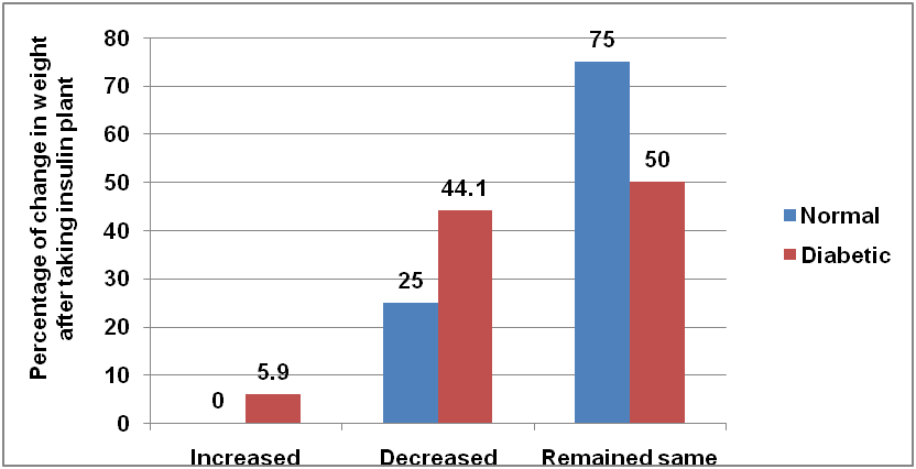 The decrease in the fatigue was reported by 80.6% subjects while 19.4% subjects said that there was no change in fatigue after taking insulin plant. The decrease in the weight was reported by 43.1% subjects while 51.4% peoples said that there was no change in weight and only 5.6% person noticed an increased in the weight after taking insulin plant (fig. 11).