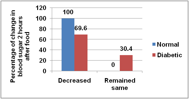 Decrease in the fasting blood sugar was reported by 95.8% subjects (98% among diabetics and 50% among normal) (fig. 12). In the case of postprandial (2 hr after food) sugar level 70.8% subjects noticed a decrease in blood sugar 2 h after food and 29.2% subjects responded that there was no change in blood sugar 2 h after food (fig. 13).