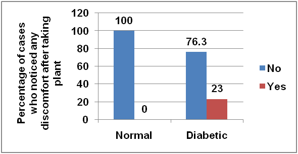 Any adverse effect or discomfort was not reported by the majority of subjects (100% among normal and 76% among diabetics) after taking insulin plant whereas 23% among diabetics reported some complications which were related to abdominal problems like gastric discomfort and acidity (fig. 16).