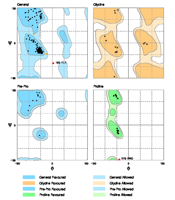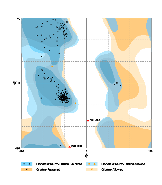 The two residues found in unfavored regions are Alanine and Proline in 163 & 279 position. These residues have steric hindrance because of Alanine without a side chain and Proline with no free side chain. Thus except these two residues all other amino acids in the predicted model fall in favored and slightly favored regions.