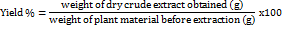 C. fel-terrae and C. heyneana were collected from Pancur Batu subdistrict, Deli Serdang district. Collected plant samples were washed under running tap water, dried, powdered in a grinder and stored in airtight jars. The plant identification was confirmed by The Indonesian Academy of Sciences, Indonesia Number 1775/IPH.1.01/ If.07/ VIII/2016. As much as 220 gram the dried leaves ofC. fel-terraeand 212 gram rhizome ofC. Heyneana were extracted with maceration method using2.5 L of ethanol until discoloration, then ethanol was evaporated at 40 °C in a rotary vacuum evaporator. The yield of C. fel-terrace leaves extract was 26.55 gram (12.07%) and for C. heyneana was 25.48 gram (12.02%). The extracts were stored at 2-8 °C and used for determining the activity. The percentage yield of extracts was calculated by the following formula: