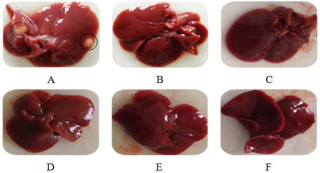 Fig. 2: Macroscopic of the liver, (A) negative control, the liver with white spot and the colour is pale red; (B) dose of 50 mg/kg, the liver has no spot and the colour is pale red; (C) dose of 75 mg/kg, the liver has no spot and the colour is reddish brown; (D) dose of 100 mg/kg, the liver has no spot and the colour is reddish brown; (E) positive control, the liver has no spot and the colour is reddish brown; (F) normal control, the liver has no spot and the colour is reddish brown