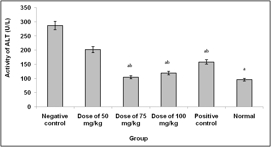 Based on table 3 and fig. 3, ALT of the negative control group increased significantly due to induction of rifampin and isoniazid compared to normal group (p<0.05). Administration combination of extracts at the dose of 50 mg/kg could not prevent elevation of ALT. Whereas at the doses of 75 and 100 mg/kg, the combination of extracts was able to prevent increasing of ALT compared to negative control group (p<0.05). Moreover, the ALT value of those groups was the same as normal control.