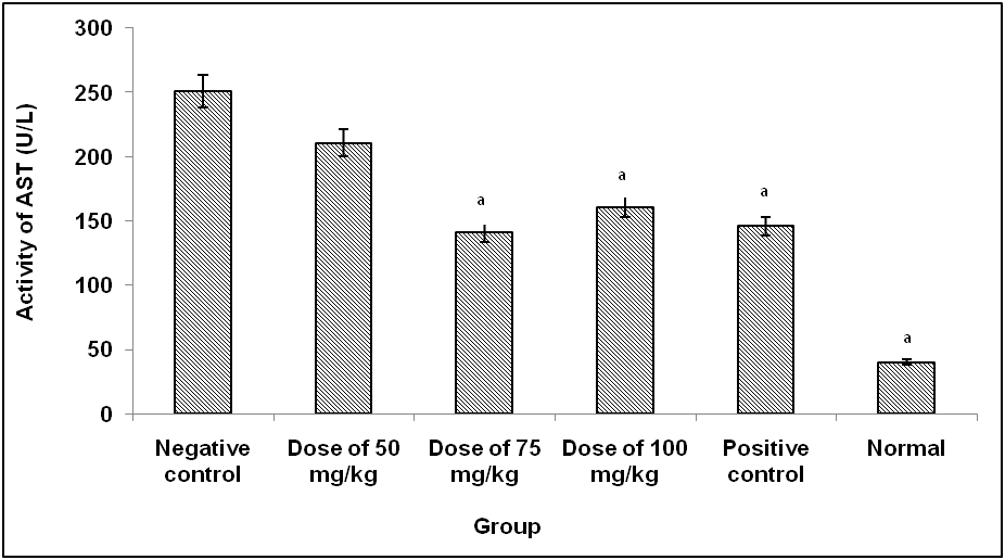 Besides ALT, AST increased significantly compared to normal group (p<0.05). Administration combination of extracts at the dose of 50 mg/kg could not prevent elevation of AST. Whereas at the doses of 75 and 100 mg/kg, the combination of extracts was able to prevent the elevation of ASTcompared to negative control group (p<0.05)
