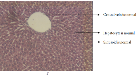 Fig. 4: Histopathology of the liver cell (10x10); (A) negative control; (B) dose of 50 mg/kg; (C) dose of 75 mg/kg; (D) dose of 100 mg/kg; (E) positive control; (F) normal control