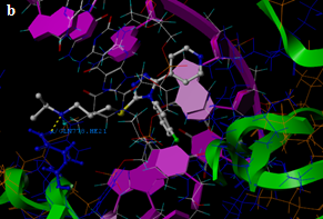Energy minimized 3D structure of Etoposide showed that the A & C rings oriented perpendicular to ring B. Etoposide exhibited a docking score of 13.72. The oxygen atom in the methoxy group of the phenyl ring in etoposide formed H-bonding with –NH group of glycine 778 at a distance of about 1.813 A˚. Oxygen atom in the dioxane ring of etoposide formed H-bonding with aspartic acid 479 at a distance of about 1.940 A˚ (Figure 1a).