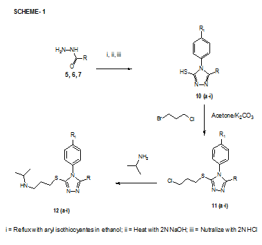 The strategy adopted to synthesize the molecules is depicted in Scheme 1. The aryl carbohydrazide (5-7) were converted to 3,4- diaryl, 5 mercapto 1,2,4-triazoles (10 a-i) by base catalysed cyclization of respective thiosemicarbazides. The triazoles are then treated with 1- bromo-3-chloro propane followed by isopropylamine to yield the3-(4,5-substituted)-4H-1,2,4-triazol-3-ylthio)-N-isopropylpropan-1-amine derivatives (12a-i).