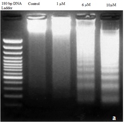 DNA fragmentation study was performed by agarose gel electrophoresis[29]. Gel electrophoresis was carried out on i-Mupid mini- gel electrophoresis unit from Eurogentech. The DNA ladder (180bp) used for the study was obtained from Sigma Aldrich.