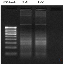 In compound 12g, DNA was incubated with three different concentration of the drug (1 μM, 6 μM & 10μM). The control DNA showed no migration in the gel as there was no fragmentation of DNA. It formed a smear around the well. DNA treated with 1 μM concentration of drug also failed to induce fragmentation as shown in Figure 2a. This is understood from the fact that the DNA has migrated as a smear around the well. It was similar to the control sample. However, DNA samples treated with 6 μM and 10 μM of 12g showed fragmentation of DNA similar to the apoptotic ladder. DNA has initially moved as a smear and then shown fragmentation patterns similar to the ladder. As the concentration of 11b is increased from 6 μM to 10 μM, the extent of fragmentation has increased.
