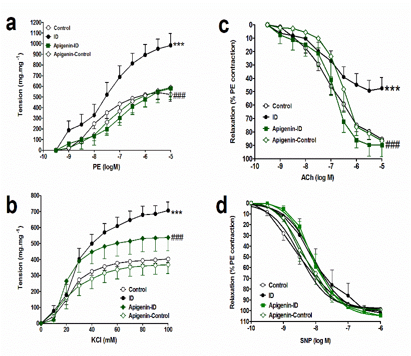 Fig. 1: Effect of apigenin incubation (7 µM, 20 min) on the vasoconstriction response to (a) phenylephrine, (b) and KCl and the vasodilation response toACh and (d) SNP in isolated insulin deficiency (streptozotocin-induced) aortae (ID; 50 mg/dl, for 10 w). Symbols indicate mean±SEM for N=6-8 animals; ***p<0.001, compared with the corresponding control group values ###p<0.001 compared with the corresponding insulin-deficient group values; by one-way analysis of variance (ANOVA) and Newman-Keuls post hoc test