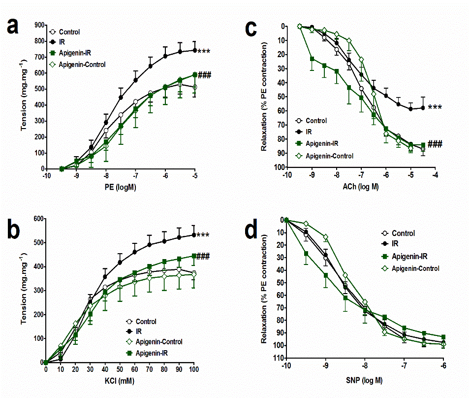 Fig. 2: Effect of apigenin incubation (7 µM, 20 min) on the vasoconstriction response to (a) phenylephrine, (b) and KCl and the vasodilation response toACh and (d) SNP in isolated insulin resistance (fructose-induced) aortae (IR; 10% in drinking water, for 12 w). Symbols indicate mean±SEM for N=6-8 animals; ***p<0.001, compared with the corresponding control group values; ###p<0.001 compared with the corresponding insulin-resistant group values; by one-way ANOVA and Newman-Keulspost hoc test