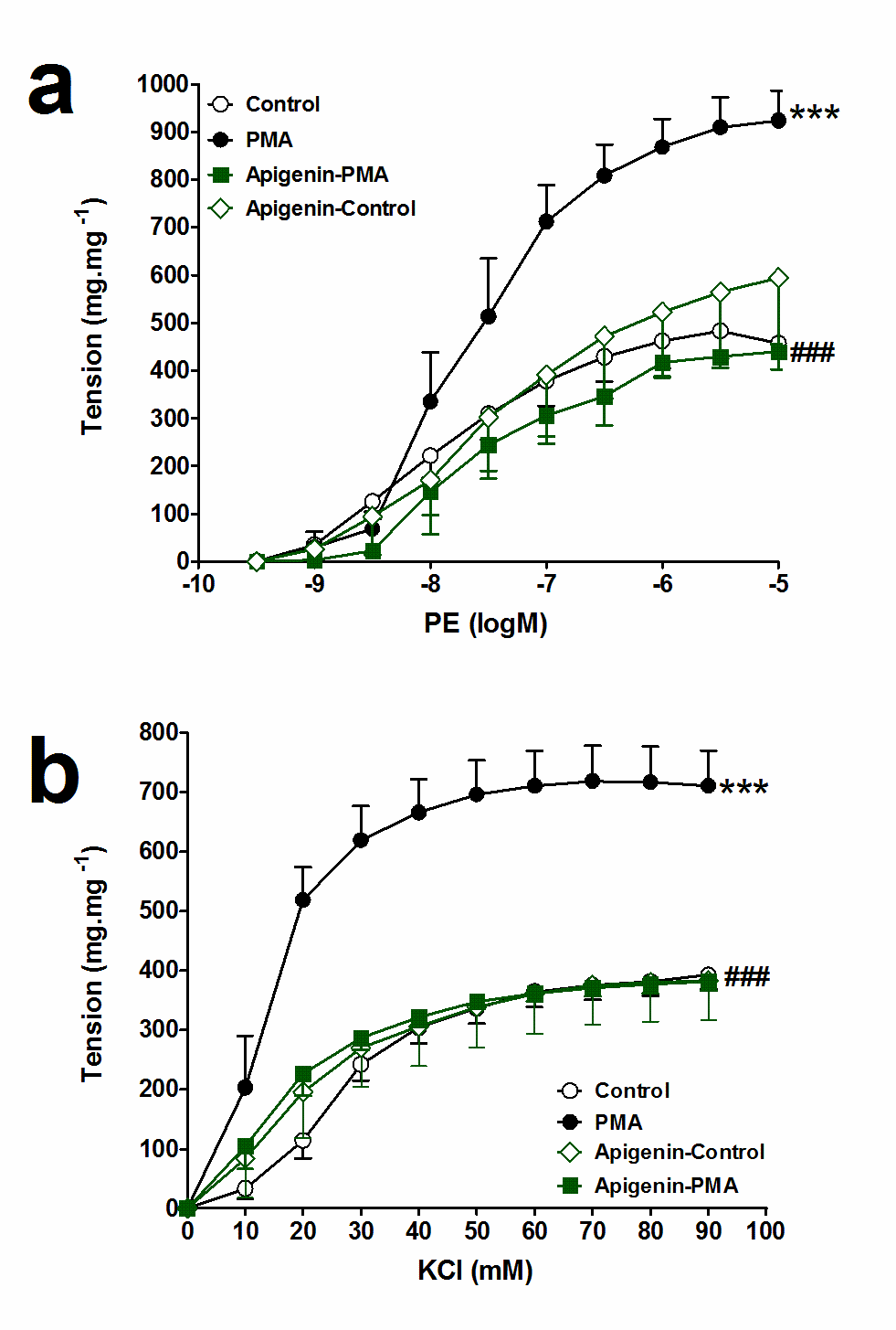 Fig. 3: Effect of apigenin incubation (7 µM, 20 min) on the vasoconstriction response to (a) phenylephrine, (b) and KCl in injured aortae induced by PMA (800 nM, 1 hour) incubation. Symbols indicate mean±SEM for n =6-8 animals; ***p<0.001, compared with the corresponding control group values; ###p<0.001 compared with the corresponding PMA group values; by one-way ANOVA and Newman-Keuls post hoc test