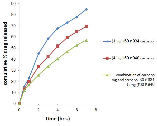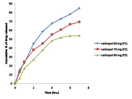 This may be due to increased penetration of water into polymer. Similarly increase the swelling of carbopol which holds the water inside the matrix and thus decrease the release of drug from the dosage form. This shows that carbopol 934P represents negative trends towards floating duration which is not desirable in floating drug delivery system[24]. Carbopol 934P might be higher affinity to water produce layer over tablets, which prevent dissolution of drug[25]. Non dissolved drug is not available for diffusion, while in the case of high initial drug loadings, the inner structure of the matrix changes significantly during drug release, becoming more porous and less restrictive for diffusion upon drug depletion[26].