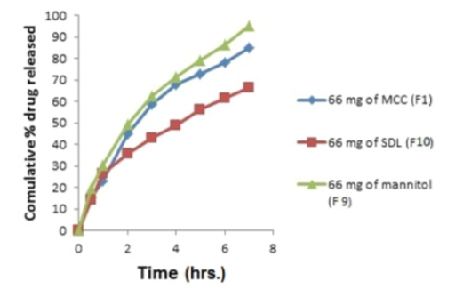 Mannitol showed the best release properties as a diluent when compared with Avicel pH 102 and SDL the drug release was accelerated.