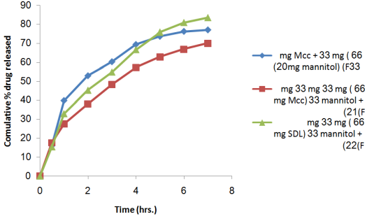 Lactose is well known water soluble filler, so incorporation of lactose leads to increase in hydration rate and relaxation of the polymer chains, resulting in more dissolved drug diffusion out from the matrix[30], by changing of MCC to mannitol in formula 9 increase in the rate of desloratadine release due to mannitol was selected as a diluent considering its advantages in terms of easy availability and negative heat of dissolution, it is water-soluble, non-hygroscopic, and produces a semi-sweet, smooth and cool taste. Because of its low hygroscopicity, mannitol is potentially an excellent excipient since it is compatible with the majority of active pharmaceutical ingredients[31]. (show in Figure3)